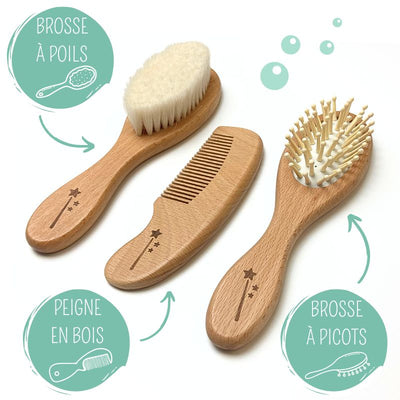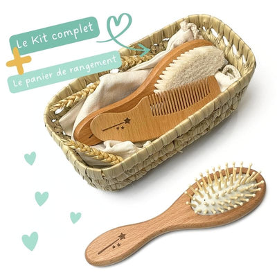 Voici l'ensemble pour un cadeau personnalisé parfait. Le kit complet avec les 2 brosses et 1 peigne personnalisé avec son panier de rangement sera le cadeau ultime pour un bébé ou une naissance.
